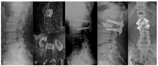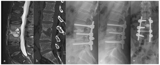 Initial X-ray shows a retrolisthesis L2/3 with mild segmental degeneration in a sixty-two-year-old male patient (a). Follow-up MRI due to persistent pain six weeks later shows pyogenic spondylodiscitis in L2/3 with progressive bony destruction (b). Directly postoperative (c) and 12 months (d,e) postoperative a.p. and lateral radiographs with anterior PMMA leakage, bone regeneration, and stable implants.