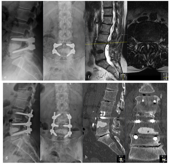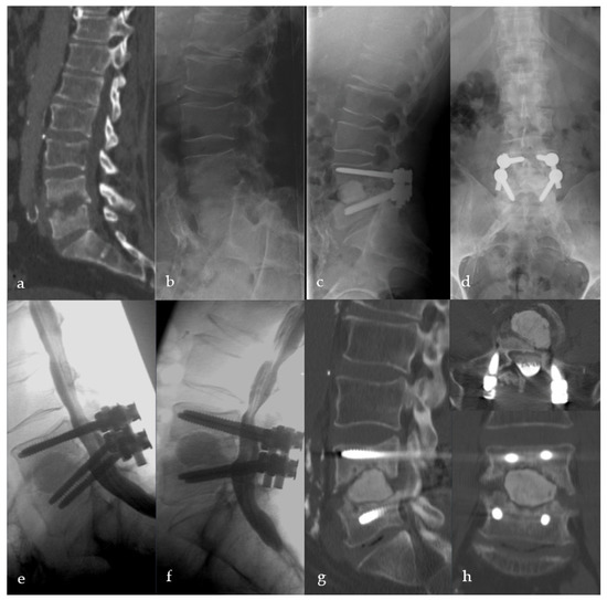 Sixty-two-year-old male patient with severe destructive spondylodiscitis L4/5. Preoperative CT-Scheme and lateral X-ray (a,b). Three-month follow-up radiograph (c,d). X-ray and CT scan one year after surgery showing anterior, intervertebral pseudarthrosis with stable posterior implants (e–h).