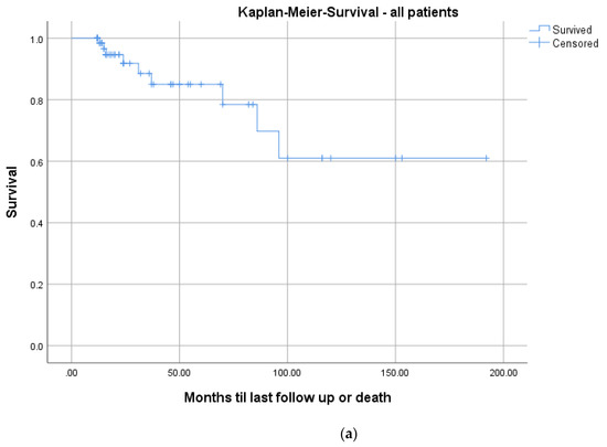 Data were collected using Microsoft Excel Spreadsheet (Microsoft Office 2016, Microsoft Corporation, Redmond, WA, USA). Statistical analyses were performed with SPSS (Vers.25, IBM Corporation, Armonk, NY, USA). Kaplan–Meier Survivorship analysis was performed with the endpoint defined as patient death. The difference between the survivorship curves was calculated using the log-rank test. Normal distribution was tested using the Shapiro–Wilk test. Differences in clinical and radiological outcomes were computed using the Student’s t-test for normally distributed (Wilcoxon Signed-Rank Test for non-normally distributed) continuous data. Comparisons of independent data were calculated with the independent t-test for normally distributed data (Mann–Whitney U-Test for non-normally distributed data).
