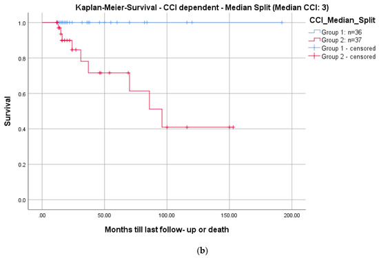 Kaplan–Meier survival curves for all patients (a) and differentiated by comorbidities determined with a median split of the CCI: CCI ≤ 3; n = 36 (blue graph) and >3; n = 37 (red graph), log-rank test: p = 0.005 (b).