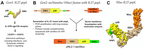 Development of IL-27 chimeric cytokines. (A) Generation 1 (Gen1) of IL-27 (IL27p28 and EBI3 subunits) with pepL at the C-terminus. Antitumor pathways listed briefly summarize the signaling effects reported in [8]. (B) Generation 2 (Gen2) of the IL27.pepL consists of its fusion at the N-terminus to a secreted Nanoluc (Nluc). Shown is the vector evolution of targeted Nanoluc-27 (Nluc-27.pepL). Mouse IL-27elasti fragment from pUNO1-mIL-27(ebi3p28) (InvivoGen) with a 3′ insertion of a sequence-encoding peptide linker (GGGGS) (not shown) followed by the sequence for the targeting peptide (pepL: LSLITRL), lime green; scrambled control (scr1: IRSLTLL), not shown; or irrelevant-peptide control (irrel1: SIFSSHM), not shown. pNLF1-secNluc (Promega) was used as the vector backbone and was linearized using EcoRI. NEBuilders HiFi DNA-assembly cloning kit (#E5520S) was used to generate plasmids with the fusions of Nluc and targeted IL-27-expression vectors. (C) In silico modeling of the final construct of Nluc-27 (I-TASSER) showing the targeting module (pepL) is solvent exposed (lime green).