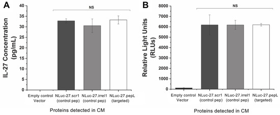 Expression-level analysis of secreted Nluc-27 molecules in conditioned media with (A) quantitative ELISA of IL-27p28 in pg/mL, and (B) luciferase activity reported as relative light units (RLUs/s) of NLuc fusion IL-27 using the Renilla luciferase assay (Promega). Both assays indicate the final fusion products are active with equivalent expression levels. The correlation coefficient was calculated to be 0.995. Data are presented as mean ± SEM. Comparisons were performed using one-way ANOVA. A p-value ≥ 0.05 indicates a non-significant difference (NS).