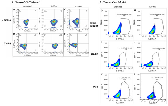 IL-6Rα- and IL-27Rα-expression profile on surfaces of cells utilized as reporter or ‘sensor’ cells to validate 2nd-generation Nanoluc-27 targeting. Both (A,D) are unstained controls of sensor cells. Around 30% of HEK293 cells displayed IL-6Rα, whereas ~90% of THP-1 cells displayed the receptor on their cell surface in measurable densities (B,E). Both HEK293 and THP-1 displayed negligible densities of IL-27Rα (C,F). 2. IL-27Rα-expression profile on surface of cancer-cell models. (G,I,K) are unstained controls of model cells. IL-27Rα-expression levels in MDA-MB231 (positive control) at 8.91% (H), C4-2B cells at 0.26% (J), and PC3 cells at 3.77% (L).