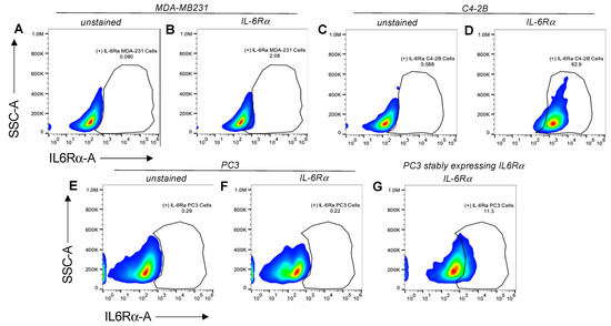 IL-6Rα-expression profile on the surface of cells utilized in STAT-1/-3-activation assays. MDA-231 cells (B) serve as a model of cell lines with ‘lower levels’ of the receptor. (A,C,E) are unstained controls of tested cell lines. More than 90% of C4-2B cells (D) expressed measurable levels of IL6-Rα. PC3 cells expressed negligible levels of IL-6Rα (F), while ~11% of PC3 cells stably expressing an IL6Rα construct (plasmid transfection and antibiotic selection) showed detectable levels of the receptor (G).