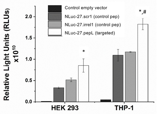 To assess binding of Nluc-27 to the proposed targeted receptor (IL-6Rα) (Figure 6), we used HEK293 and THP-1 cells, which we have characterized as displaying differential expression of this cell-surface receptor (Figure 4). All peptide-modified Nluc-27 species exhibited binding to both HEK293 and THP-1 to some extent. However, modification with pepL enhanced the Nluc-27 signal accumulation in both HEK293 and THP-1, with significantly greater binding of Nluc-27pepL to THP-1, which is a cell line with higher receptor density.