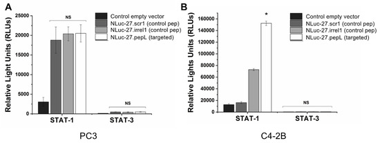 STAT-1 and STAT-3 activation in PC3 and C4-2B prostate ‘cancer-cell’ models following treatment with Nluc-27-conditioned media. (A) Treatment with targeted Nluc-27pepL in PC3 cells induced STAT-1 activation in response to targeted (pepL) and non-targeted Nluc-27 (Scr-1, Irrel-1), with minimal activation of STAT-3 (non-significant, ns). (B) Treatment with targeted Nluc-27pepL in C4-2B cells induced a 12-fold in STAT-1 activation relative to control vector, with no significant changes (ns) in STAT-3 expression in response to treatment with Nanoluc-27 (targeted or non-targeted). Data are presented as mean ± SEM. Comparisons within cell types were performed using one-way ANOVA. A p-value < 0.05 indicates a significant difference (*).
