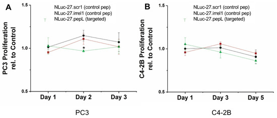 To evaluate the therapeutic potential of targeted Nluc-27.pepL, we assessed changes in prostate-cancer-cell numbers over time in vitro as an estimate of prostate-cancer-cell proliferation. This assay was performed in transwell cultures with C2C12 mouse myoblast cells transfected with different plasmids to express either Nluc-27 with C-term control peptides (scr1, irrel1) or Nluc-27.pepL (targeted) fusion proteins. PC3 cells cultured in Nluc-27.pepL-conditioned media (CM) exhibited a reduction in cell proliferation compared to the controls (Figure 8). Similarly, C4-2B cultured in Nluc-27.pepL CM showed reduced cell proliferation compared to the controls. The reduction in cell proliferation was likely more prominent in C4-2B due to their higher density of the target receptor (IL-6Rα). Although a pattern of reduced cell proliferation was only significant at day 2 of the PC3 assays (Figure 8A), treatment with targeted Nluc-27.pepL promoted a more sustained trend of reduced C4-2B proliferation throughout the experiment (Figure 8B), although this difference did not reach significance.