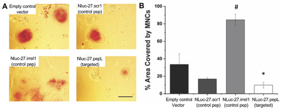 Targeted Nluc-27.pepL inhibits RANKL-mediated osteoclast formation in pre-osteoclastic cell line RAW 264.7. (A) NLuc-27.pepL significantly reduced the size of osteoclasts formed compared to the control empty vector or Nluc-27.scr1 (*, p < 0.05). (B) The Nluc-27.irrel1 control induced significantly larger multinucleated cells (MNCs) compared to the other three groups (#, p < 0.05). Comparisons were performed using unpaired t-test. Scale bar 100 μm.