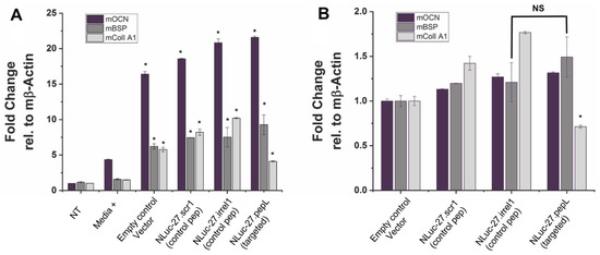 We also evaluated the effects of targeted NLuc-27.pepL on genes associated with osteoblast differentiation (mouse osteocalcin, mOCN; bone sialoprotein, mBSP; and collagen IA1, mColI A1). The negative control (NT) and positive control (media+, containing differentiation supplements) exhibited the expected profile of gene expression in differentiating-osteoblasts gene expression (Figure 10A). All groups treated with conditioned media (CM), including the empty-plasmid control (pORF9-0), exhibited a significant increase in the expression of all three genes related to osteoblast differentiation compared to the positive control (media+). Treatment with NLuc-27s CM resulted in a moderate yet statistically significant increase in osteoblast-differentiation gene expression, with targeted NLuc-27.pepL inducing a trend of higher expression of OCN and BSP relative to the empty-plasmid control (Figure 10A,B). ColIA1 expression in cells treated with Nluc-27.pepL was significantly lower than in cells treated with CM from the controls (control pORF9-0 or empty vector control, NLuc-27.scr1 or irrel1), yet significantly higher than ColIA1 expression in cells treated with media+.