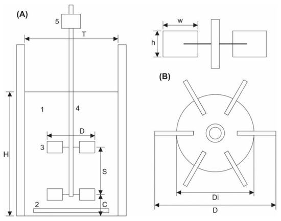 (A) Schematic representation of the stirred tank reactor (1. stirred tank, 2. ring-type bubble diffuser, 3. Rushton impeller, 4. Axis and 5. Rotation sensor), with the geometric proportions (H/T = 1.35, D = T/2, C = T/4, S = T/2). (B) Rushton impeller sketch with six blades to shaft (w/D = 1/3, h/D = 1/4, Di/D = 2/3). Schematics were adapted from Luan et al. [45].