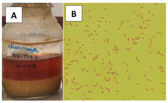 The acidophilic iron-oxidizing bacterial consortium enriched from a porous chalcopyrite mineral collected at Century Mining gold mine in the Arequipa region, Peru. (A) Bacterial culture. (B) Gram-negative bacteria observed under light microscopy.