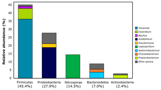 Bacterial profiling of the enriched acidophilic iron-oxidizing consortium revealed that approximately 90% of the community is dominated by the bacterial phyla Firmicutes (45.4%), Proteobacteria (27.9%) and Nitrospirae (14.5%) (Figure 3). The dominance of these taxonomical groups is mostly due to the abundance of one or two bacterial phylotypes belonging to each phylum. For Firmicutes, the genera Tissierella (36.6%) and Clostridium (6.6%) contribute almost entirely to the overall abundance of this phylum (Figure 3), while for Proteobacteria the same is observed due to the representation of Acidiphillium (19.0%) bacteria in the enriched consortium (Figure 3). For the Nitrospirae phylum, this contribution is even more evident, as its entire representation in the consortium is the result of the occurrence of Leptospirillum taxa (Figure 3). Although less represented, other bacterial genera were also detected in the consortium, including Sediminibacterium (3.6%), Pseudomonas (2.3%), Propionibacterium (1.9%), Chryseobacterium (1.9%) and Bacillus (1.2%).