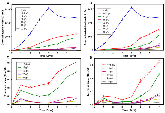 Figure 4C,D show the tolerance index (TI) of the enriched microbial consortium for Cu and Zn concentrations between 0 and 33 g/L. TI decreased with the increase in Cu and Zn concentrations. When these metals were added to the culture medium, the highest TI values of 0.507 and 0.643 were obtained at the concentration of 10.5 g/L of Cu and Zn, respectively. Two stages are shown in the TI curves at concentrations ≥13 g/L; (a) the lag phase that occurs during 4 days at the beginning of the process, with TI = 0.113 (Cu) and TI = 0.046 (Zn); (b) continuous rapid growth of the curves until day 7 with TI = 0.387 (Cu) and TI = 0.458 (Zn).