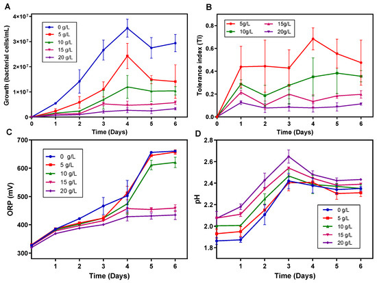Growth (A), tolerance index (B), oxidation-reduction potential (ORP) (C) and pH (D) registered in the enriched acidophilic iron-oxidizing consortium cultures in the presence of PCBs waste.