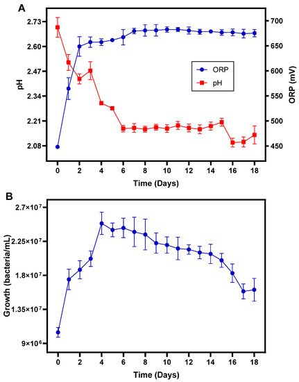 The ORP is the most important parameter that reflects the extension of oxidation and reduction reactions in the culture medium during the bioleaching of PCBs waste with, generally, high ORP values indicating better oxidation of metals [67]. In an acid culture, medium oxidation occurs by ferric ions (Fe3+) of Cu, Zn, gold and tin composing PCBs waste results in iron reduction (Equations (3)–(6)) and in the decreasing of the ORP of the solution, while oxidation of ferrous ions (Fe2+) to ferric ions (Fe3+) by the bacterial consortium leads to an increase of the ORP of the leaching solution [22,42]. Therefore, the ORP in the solution is the result of metal oxidation, microbial activity and leaching conditions such as aeration (O2 and CO2), pH, agitation and temperature [46]. Figure 7A shows the evolution of ORP in the bioreactors supplemented with 10 g/L of PCBs waste. The powder from PCBs waste had an immediate effect on the ORP at the beginning of the process (Table 2). Before supplementing the microbial cultures present in the bioreactors with PCBs powder, the ORP was 670.35 mV as a result of the oxidation of the ferrous iron (Figure 6B), however, after supplementing with 10 g/L of PCBs powder the ORP dropped sharply to 448.17 mV (Table 2) due to the alkaline components present in the PCBs. After 2 days of growth with PCBs, the ORP increased rapidly to 648.9 mV due to the oxidation of ferrous ions (Fe2+) to ferric ions (Fe3+) by the action of the acidophilic iron-oxidizing bacterial consortium, achieving a steady value after day 8, between 675–780 mV. The time required to reach the maximum value of ORP, 682.73 mV, was 10 days, similar to the value obtained by Xia et al. [46] of 699 mV with a consortium formed by Leptospirillum ferriphilum and Acidithiobacillus caldus. Nonetheless, lower increases in the ORP resultant from the bioleaching process were also reported. For example, Willner et al. [61] showed an increase in ORP between 400 and 550 mV after 14 days of bioleaching with Acidithiobacillus ferrooxidans. In terms of growth, the consortium reached its maximum growth on day 4 with 2.5 × 107 bacteria/mL (Figure 7B).