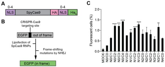 Evaluation of the cellular activity of multi-NLS SpCas9 proteins in HEK293-derived EGFP reporter cells. (A) Design of multi-NLS SpCas9 proteins. (B) Schematic representation of HEK293-derived EGFP reporter cells for evaluation of CRISPR-Cas9 cellular activity. (C) EGFP activation by lipofection of SpCas9 RNPs. SpCas9 proteins of 10 μg and sgRNA of 5 μg are complexed and transfected into reporter cells by CRISPRMAX. In total, 2 × 104 cells are sorted. The data are shown as mean ± SD (n = 4). The multi-NLS SpCas9 variants with significantly improved EGFP activation in comparison with N0/C1 construct are indicated. Significant difference is calculated using Student’s t test (**, p < 0.01; ***, p < 0.001; ****, p < 0.0001). The difference between SpCas9 groups and mock group is determined using one-way analysis of variance (ANOVA) with Dunnett’s multiple comparisons test. Single- and multi-NLS groups have P values of less than 0.001 in comparison with mock group. N0/C0 is not significantly different from mock (p = 0.5020).