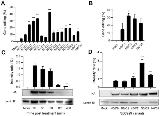 Next, we sought to investigate the kinetics of multi-NLS SpCas9 proteins in cells. Western blotting analysis showed that the majority of N0/C1 SpCas9 protein was degraded after 2 h post nucleofection in K562 cells (Figure 3C). Comparison of nucleus-localized protein at 1 h post nucleofection revealed that C-terminal multi-NLS could enhance nuclear localization of SpCas9 proteins (Figure 3D) despite that the proteins were nucleofected into cells and were supposed to have high efficiency of nuclear localization [24].