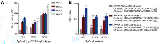 To determine the effects of multi-NLS fusion on the specificity of SpCas9 proteins, we chose to analyze the on-target activities of two previously described sgRNAs and their off-target activities at three genomic sites [26] under the context of multi-NLS SpCas9 variants. The on- and off-target activities were separately determined by T7E1 and the non-specific activity of SpCas9 was presented as off/on targeting ratio. It was found that compared with N0/C1, N1/C2 and N0/C4 SpCas9 proteins did not exhibit notably increased non-specificity, as indicated by the off/on ratio, for most conditions tested (Figure 4B and Figure S5A,B). These results suggested that multi-NLS fusion could, by a large extent, retain the specificity of SpCas9 proteins.