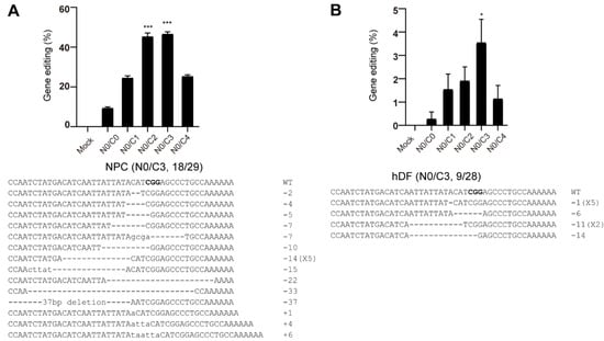 Genome editing of hNPCs (A) and hDFs (B) using multi-NLS SpCas9 proteins. The cells are nucleofected with 30 μg SpCas9 proteins and 30 μg CCR5 sgRNA. The editing efficiencies are determined by T7E1 analysis and presented as mean ± SD (n = 3 technical replicates). Representative Sanger sequencing results are shown. PAM sequence is highlighted in bold. The Sanger-sequenced clones containing modified CCR5 sites over the total sequenced clones are indicated as 18/29 and 9/28 respectively. The difference between N0/C1 and multi-NLS constructs is analyzed by two-tailed Student’s t test. *, p < 0.05; ***, p < 0.001. The difference between SpCas9 groups and mock group is determined using one-way analysis of variance (ANOVA) with Dunnett’s multiple comparisons test. In NPCs (A), all SpCas9 groups have P values of less than 0.001 in comparison with mock group. In Jukat cells (B), p = 0.975 for N0/C0, p < 0.05 for N0/C1 and N0/C2, p < 0.001 for N0/C3, p = 0.149 for N0/C4.