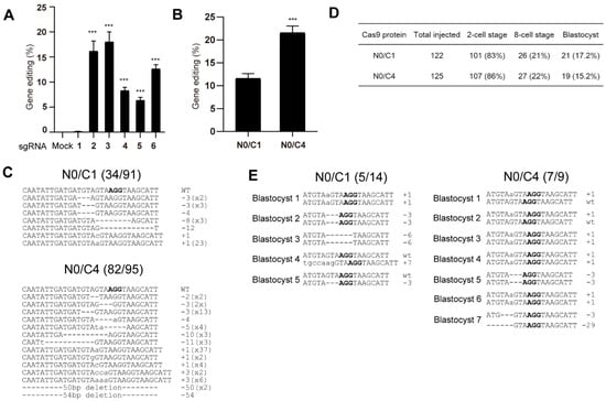 Microinjection was carried out at Shanghai Model Organisms Center Inc. (Shanghai, China) with the approval from Animal Care and Use Committee (2016-W-1516, 24 August 2016) using a described protocol [23]. Superovulated female C57BL/6J mice of 3–4-week-old were mated to male C57BL/6J mice of 8–12-week-old. Fertilized embryos were collected from oviducts. All experiments were conducted in accordance with the guidelines of the American Association for the Accreditation of Laboratory Animal Care (AAALAC). For Cas9 protein injection, 160 ng/μL of Cas9 proteins and 50 ng/μL sgRNA were co-injected into the pronucleus of fertilized eggs. All injected zygotes had well recognized pronuclei. After microinjection, zygotes were cultured in KSOM mouse embryo culture medium supplemented with amino acids at 37 °C under 5% CO2 until blastocyst stage at 3.5 days. For sequence analysis, CRISPR/Cas9 target sites were PCR amplified, cloned into pEASY-Blunt-Zero Cloning Kit (Beijing TransGen Biotech, Beijing, China) and then sequenced with M13 primer.