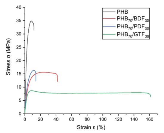3.2. PHB/Additives Blends and Their Mechanical Properties