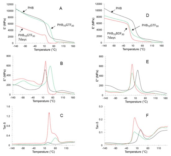 | PHBxBDF100−x | Time after extrusion (day) | Tg theo. (°C) | Tg (°C) | TmPHB (°C) | ΔHm PHB (J/g) | TmBDF (°C) | ΔHm BDF (J/g) |