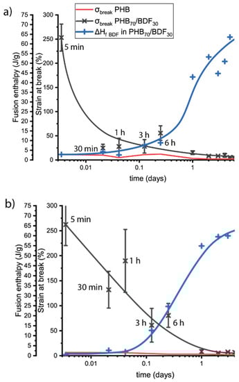 | Number of Anneals | εbreakPHB70BDF30 (%) | εbreak PHB100(%) | σbreakPHB70BDF30 (MPa) | σbreak PHB100 (MPa) |