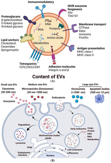 EVs are heterogeneous, ranging from 30 nm to 10 µm in diameter and encompass several types of vesicles, including but not limited to apoptotic bodies, which are large vesicles released from cells undergoing apoptosis; microvesicles, which are released from an evagination of the plasma membrane; and exosomes, which are formed in multivesicular bodies (MVBs), that then fuse with the plasma membrane to release the vesicles into the extracellular fluid (Figure 1B, Table 1) [10,12,21,22].