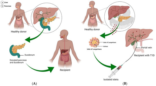 The continuous glucose monitoring systems, unfortunately, are not capable of rapid responses to glycemic variability as might be produced by illness, stress, or a simple unannounced meal [2]. Moreover, though insulin administration offers some regulatory abilities, many patients develop chronic complications or become disabled by refractory hypoglycemia [66,67]. An alternative treatment option is the transplantation of the pancreas or islet β-cells to prevent or slow the complications and progression of T1DM, improving longevity and quality of life (Figure 3A). Though pancreas transplantations continued to evolve and develop over time (for the full record, see [66]), the number of pancreas transplants are dropping. This is due to inherent surgery risk and improvements in other treatment options, with a 20% decrease in transplants in the USA between 2005 and 2014, transplants peaking in 2004 [44,68]. Transplantations as treatments for T1DM are generally only considered in patients who exhibit a history of hard to control diabetes, defined as ≥1 episode of severe hypoglycemia per year, frequent and severe metabolic or microvascular complications, and problems with exogenous insulin therapy [69,70,71,72]. As such, pancreas transplantations are typically only performed 20 years after diabetes diagnosis [69]. Transplanting a pancreas can fully replace the β-cell mass and as such, is considered the only “near-cure” for T1DM, while transplanting islet β-cells can only partially restore the population of insulin-secreting cells needed for insulin and glucose regulation [66]. The first documented pancreas transplants were performed in the 1960s–1970s on uremic diabetic patients in combination with a kidney transplant [44,48,66]. Early surgeries found that transplanting a pancreas alone led to a high rate of organ rejection, while cases in which a pancreas and a kidney were simultaneously transplanted had minimal organ failure (though were susceptible to numerous other issues accompanying surgery such as thrombosis or infection) [66]. Recent reports indicate that this graft survival trend has continued, with 70% graft survival in patients with simultaneous pancreas and kidney transplant, and only ~50% for pancreas in isolation [2,44,68].
