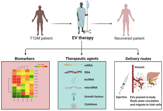 In addition, EVs from a number of cell types, including MSCs, can have therapeutic impacts on the many complications that surround T1DM, including cognitive deficits, cardiac dysfunction, microvascular complications, and even transplantation rejection [155,156,157,158]. EVs loaded with miR-222 injected into rabbits with T1DM, and diabetic retinopathy showed attenuation of retinal degeneration [159]. Diabetic nephropathy was improved through the delivery of EVs derived from MSCs and adipose-derived stem cells by induction of autophagy [85,160,161] Though a number of studies regarding EV therapeutics use a heterogeneous population of EVs, a study by McGuinness and team (2016) found that microvesicles specifically stimulated long-term recovery and function in diabetic mice, improving glucose, insulin, and glucagon levels compared to the smaller EV population exosomes [162].
