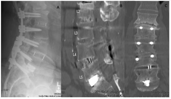 Lateral X-ray of the lumbar spine. (A) Demonstrating L2–S1 anterior interbody fusion using a combination of PEEK and titanium cages that is supported posteriorly with pedicle screw fixation. One year post-op CT sagittal (B) and coronal slices (C) demonstrate bridging callus between the interbody spaces showing successful fusion with osseointegration.