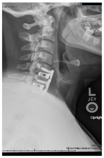 Cervical spine X-ray demonstrating a C5–C7 anterior discectomy and fusion using titanium interbodies with plate fixation.