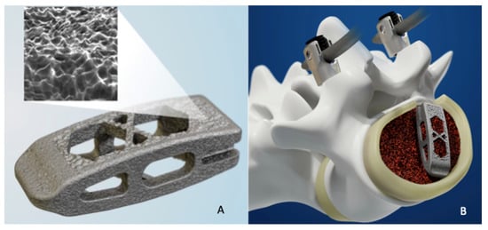 (A) 3D printed titanium cage (B) with interbody placement. Printed with permission from Medtronic PLC (Minneapolis, MN, USA).