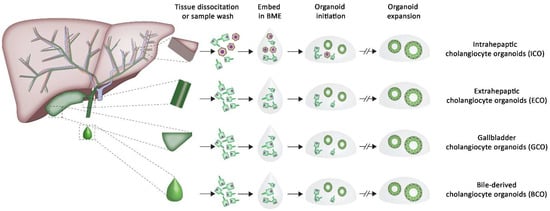 With the expansion of hepato-pancreato and biliary organoid research, a consistent nomenclature was proposed, and the liver-derived organoids were renamed to intrahepatic cholangiocyte organoids (ICO) to better reflect their origin [] (see Figure 1 for an overview of the different cholangiocyte organoids and sources). Cholangiocyte organoids were established from gallbladder tissue (gallbladder cholangiocyte organoids; GCO) [], and from the cholangiocytes’ inner lining the extrahepatic bile duct (EBD, extrahepatic cholangiocyte organoids; ECO) [,]. Organoids were also initiated from the circulating EPCAM positive cells in fresh bile samples (bile-derived cholangiocyte organoids, BCO) []. These organoids all share similar phenotypic features when cultured, as they all grow in similar spherical structures with comparable proliferation rates [,,]. They express similar progenitor and mature cholangiocyte markers, but are uniquely related to their original tissue of origin and show subtle differences. Rimland et al. showed that differences related to the regional origin of the organoids were retained between ICO, ECO and GCO []. In addition, only ICO have the potential to upregulate hepatocyte markers when grown in hepatocyte differentiation conditions [].