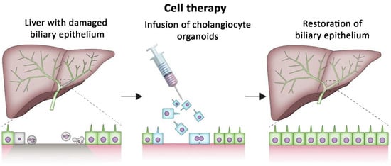 Cholangiocyte organoids can also yield cholangiocyte-like cells without the need for additional differentiation steps. Therefore, these cells are of interest for the repair of damaged biliary epithelium. Recently, ground-breaking proof of concept was given by Sampaziotis et al. They showed that cholangiocyte organoids can successfully repair deficits in the biliary epithelium of intrahepatic bile ducts after injecting cells that were derived from the organoids into the biliary tree of a mouse model (Figure 2) []. They also showed that GCO can be used to repair deficits of the biliary epithelium of human livers ex vivo while the liver was perfused on a normothermic machine perfusion device. This shows the enormous clinical potential of cholangiocyte organoids.