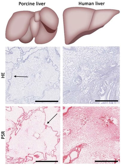 Porcine livers differ from human livers from an anatomical point of view. Porcine livers have multiple lobes, but also contain septa (indicated by black arrows). These septa are not visible in human livers. The scale bars represent 500 µm.