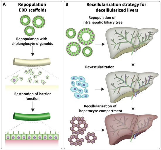 Potential future tissue engineering applications of human cholangiocyte organoids. (A) Cholangiocyte organoids can also be used to repopulate extrahepatic bile duct (EBD) scaffolds for ductal tissue engineering purposes. Subsequently, these engineered ductal scaffolds can be used to replace damaged tissue. (B) An example of a strategy for recellularization of decellularized liver ECM. Cholangiocyte organoids can be used to repopulate the entire biliary tree. Endothelial cells can recellularize the vasculature of the liver and ICO differentiated towards hepatocyte-like cells can be used to repopulate the hepatocyte compartment. These different types of cells could restore functionality of the liver.