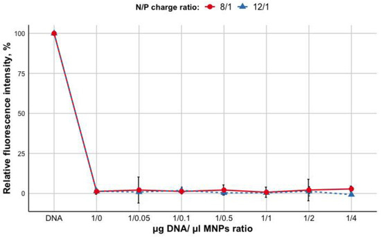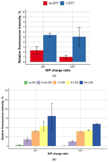 To prove the disulphide bonds role in the formation of R6p-cRGD/DNA in MNPs-containing polyplexes, we applied dithiotreitol (DTT) as a reducible agent. DTT treatment was performed for MNPs-polyplexes at a 1:0.05 w/v ratio of DNA (μg) to MNPs (μL) (Figure 3a). We observed no destabilization of DNA condensation for all the tested MNPs-polyplexes before DTT treatment. After 1 h incubation of the MNPs-polyplexes with DTT, a fractional DNA release from polyplexes was detected. The addition of DTT resulted in a 2.5–5-fold increase in fluorescence intensity, reflecting the release of DNA from the polyplexes with MNPs. The values of the relative fluorescence after incubation with DTT compared to free DNA (100%, not shown) indicate a mild effect of disulfide bonds on the stability of polyplexes, in comparison with electrostatic forces associated with the tight DNA packaging by oligoarginine [27]. Additional experiments on the stability of MNPs-polyplexes were conducted with dextran–sulfate treatment (Figure 3b).