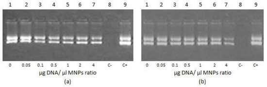 The DNAse I protection assay requires 10 μL of the peptide/DNA/MNPs polyplexes prepared with different amounts of MNPs and incubated with 0.5 units of DNase I (Ambion, Austin, TX, USA) for 30 min at 37 °C followed by 2 min of DNAse I activation, as described previously [22]. DNA was released from polyplexes with overnight 0.1% trypsin incubation at 37 °C. The DNA integrity was analyzed by 1% agarose gel electrophoresis.