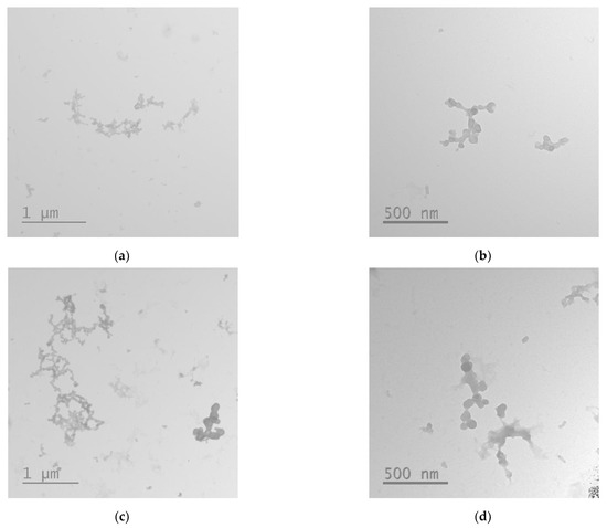 Typical micrographs of the R6p-cRGD/DNA/MNPs polyplexes obtained by transmission electron microscopy: (a,b) N/P ratio of R6p-cRGD/DNA is of 8/1; (c,d) N/P ratio is of 12/1.