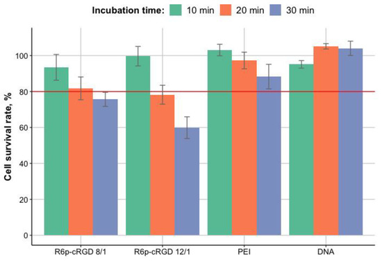 Survival rate of PANC-1 cells (%) after transfection with R6p-cRGD/DNA/MNPs polyplexes. DNA:MNP quantity ratio is 1:0.05. The threshold indicates the acceptable level of cell survival (80%).