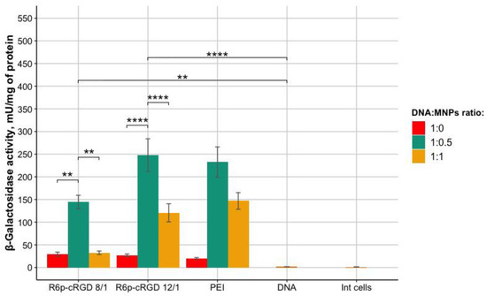 Based on the results, the highest transfection efficiency was achieved using R6p-cRGD/pCMV-lacZ/MNPs polyplexes with a DNA:MNPs ratio of 1:0.5. The polyplexes without MNPs showed a low level of transfection efficiency due to the insufficient incubation time of the polyplexes with cells. In cells transfected with nucleopeptide polyplexes with a DNA:MNPs ratio of 1:1, dramatically reduced activity of the β-galactosidase enzyme was also observed in comparison with the cells transfected with polyplexes with DNA:MNPs ratio of 1:0.5. This observation can be associated with the increasing toxicity of a large number of MNPs for the PANC-1 cells.
