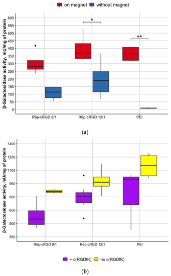 Activity of β-galactosidase after transfection of PANC-1 cells with nucleopeptide polyplexes with MNPs (a) in the presence and absence of a magnet; (b) with and without the addition of a free ligand c(RGDfK). Statistical significance was assessed by the Kruskal–Wallis test with Dunn’s multiple comparisons test (n = 6; * 0.05, ** 0.01).