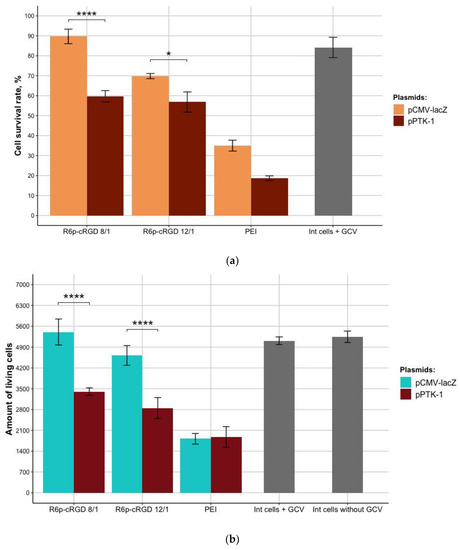 The cytotoxicity caused by R6p-cRGD/pCMV-lacZ polyplexes did not exceed that of PEI-polyplexes. Moreover, PEI-polyplexes showed high cytotoxicity, and all the detected decrease in UL cell survival seems to be associated with the innate toxicity of PEI. It should be taken into account that cell survival rate of the cells transfected with PEI/pCMV-lacZ is two-fold lower than the cell survival rate for cells transfected with R6p-cRGD/pCMV-lacZ (N/P = 12/1). This observation allows us to suggest that PEI is cytotoxic for the UL cells and cannot be used as a potential carrier for gene therapy of this disease. Similar results were obtained after Trypan blue staining, allowing dead cells’ exclusion from the counting (Figure 8b). The number of living cells after transfection by pCMV-lacZ-polyplexes did not differ from that of the control cells. The number of viable UL cells transfected with R6p-cRGD/pPTK-1/MNPs polyplexes was significantly decreased up to 30%, compared to pCMV-lacZ polyplexes. Importantly, the effects of suicide gene therapy were more pronounced using Trypan blue staining rather than Alamar Blue assay.