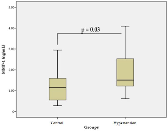 Serum levels of MMP-1 in the hypertensive group vs. control group. Data are represented as mean ± SD.