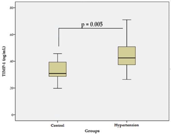 Serum levels of TIMP-1 in the hypertensive group vs. control group. Data are represented as mean ± SD.