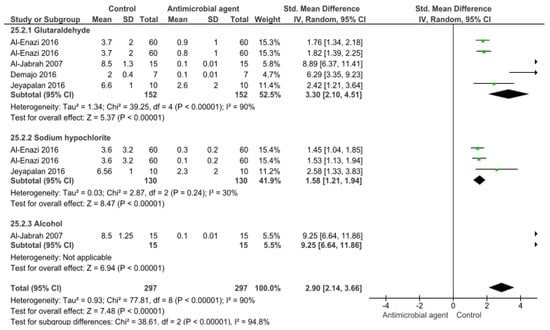 | Al-Enazi 2016 [23] | Polyvinyl siloxane Alginate | Sodium hypochlorite Glutaraldehyde | Streptococcus diphtheroid Neisseria | Colony-forming units | Use of 1% sodium hypochlorite yielded better results than did 2% glutaraldehyde. |