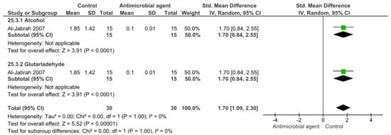 | Al-Jabrah 2007 [24] | Alginate Polyether Polyvinyl siloxane | Dimenol Perform-ID® MD520® Haz-tabs® | Does not specify | Colony-forming units | All four disinfectant solutions tested produced effective disinfection of the impression materials investigated. |