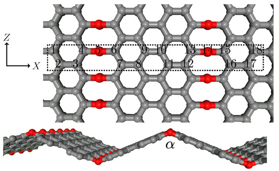From the different arrangements in which a highly oxygen-ordered configuration can be found in a GO layer, we focus our attention on the structure defined in [31] since it exhibits shape memory effect and the two different phases in which it can be energetically stable. The unit cell is depicted in Figure 1. The periodicity of the unit cell along the X and Z directions defines a 2D sheet. From the figure, it can be noticed that the oxygen epoxy groups define graphene stripes of zigzag interfaces. The electronic re-arrangement around the zigzag interfaces bends the 2D layer at angle , as shown by the optimized DFT structure also represented in Figure 1. According to [31], the GO sheet presents two phases around and [31,32], corresponding to lattice constants of and . The two phases are separated by ∼. First-principles DFT calculations will be used to validate literature results.