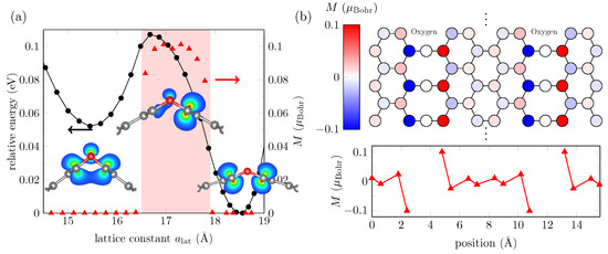 (a) Energy (black marks) and maximum magnetization (red marks) found in optimized GO nanoribbons of different widths, according to DFT calculations. The red shadowed area indicates non-zero magnetization for structures in the corresponding lattice constant range. The insets show partial charge densities around the oxygen atoms (red balls) and carbon atoms (gray balls) for three values: , , and . (b) Magnetization at each atomic site in the unit cell of a GO layer of .